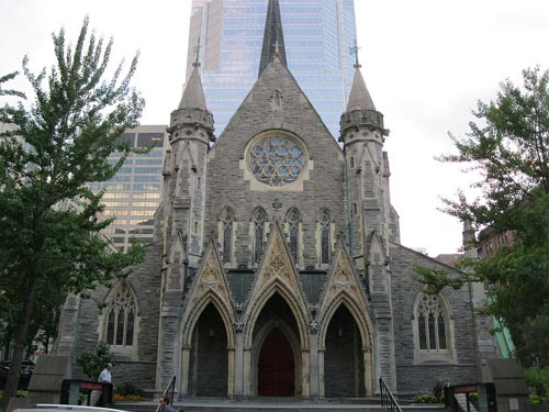 La Cathédrale Christ Church de Montréal est une église anglicane de style néogothique érigée au milieu de XIXème siècle. Construite sur un terrain friable, son clocher en pierre a du être remplacé par une réplique en aluminium en 1940.