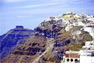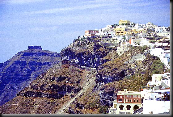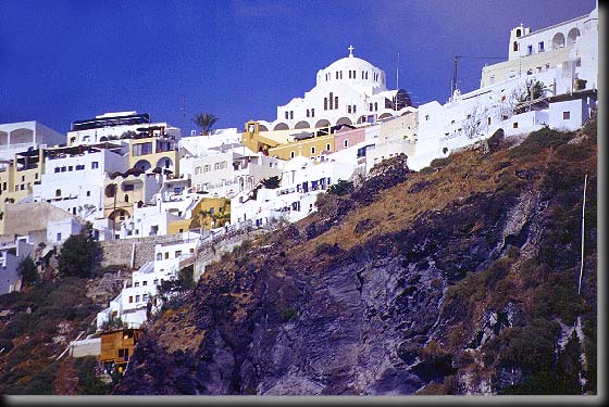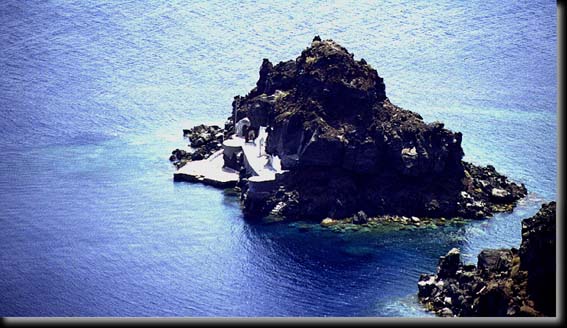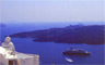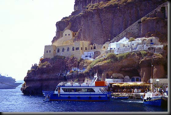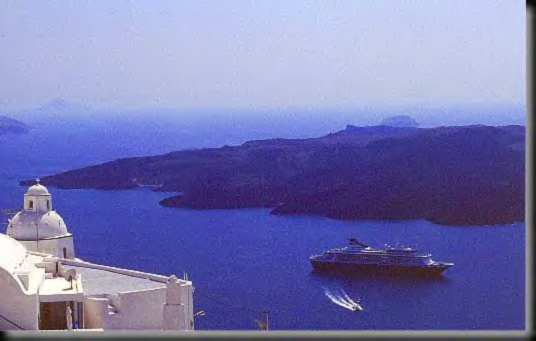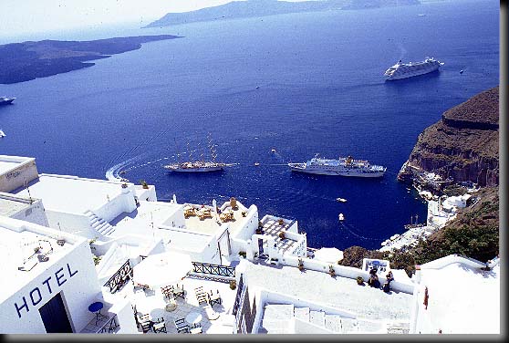 En arrivant par ferry du Nord, à partir d'autres îles des Cyclades telles que Ios ou Naxos, l'impression de ce volcan perdu en pleine mer est absolument saisissante. Cette énorme masse rocheuse, à moitié engloutie et campée à la lisière de la mer de Crète semble tout juste surgie des profondeurs sous-marines et flotter au milieu de nulle part. L'on pénètre lentement par bateau à l'intérieur du cratère immergé en contournant le pic septentrional de l'île de Théra (autre nom de Santorin), sur le sommet duquel le village de Oia est vertigineusement perché. De la pointe nord de l'île principale jusqu'au port, un panorama multicolore des différentes couches volcaniques orne les falaises escarpées de 60 à 120 mètres de haut qui ceinturent l'intérieur du croissant. Une impression d'étrangeté et d'intemporalité règne sur les lieux. Vis-à-vis de Théra et au centre du cratère, nous longeons par bateau le piton volcanique de Nea Kameni, volcan dormant mais toujours en activité, qui veille sur Santorin d'une manière inquiétante...