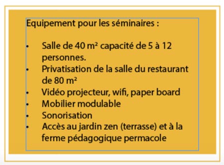 Son objectif : faire rimer entreprenariat, bien-être et éthique, au sein d’un lieu calme, idéal pour prendre du recul, s'ouvrir à d'autres relations dans le travail... et échanger avec une équipe venue d'horizons différents qui applique la vision de la permaculture, un ensemble de pratiques et de modes de pensée visant à créer une production agricole soutenable, très économe en énergie et respectueuse des êtres vivants et de leurs relations réciproques.