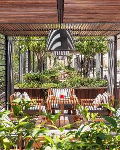 Pour les gourmets, le restaurant Lila joue la carte « ambiance », dans un espace savamment composé de niches, de bibliothèques, cheminées, murs d’arts et vinothèque donnant sur un patio de 3 000 m², véritable jardin d’Eden avec piscine aquarium, agrémenté de mobilier et transats en teck, bains de soleil balinais, fontaines, palmiers, oliviers...