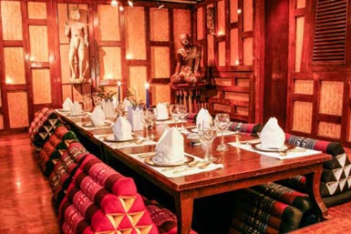Les mets, issus de la cuisine thaïlandaise traditionnelle, sont notés de zéro à trois éléphants selon leur puissance. Par exemple, Plateau royal (découverte gastronomique à travers un choix varié de plats thaïs), Coco cabane (boeuf au curry vert servi dans une noix de coco fraîche), Pla samrod (daurade royale entière rissolée et servie nappée d'une sauce authentique), Pla neung manao (petit bar entier préparé, épices thaïes et arrosé de citron vert). Elégantes de Manora (curry jaune de scampi à la fois doux et piquant)... Privatisation de 8 à 235 personnes.