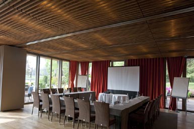 Le Pavillon Lac, bâtiment épuré constitué de baies vitrées, habillé de volets en bois mobiles qui s'ouvre sur une large terrasse en teck donnant sur le lac et les jardins (de 20 à 100 personnes).
