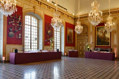 Ancienne salle du conseil des Invalides, le Grand Salon jouit d'une position centrale sur la façade des Invalides. Grâce à ses grandes baies vitrées, vos invités profiteront d'une perspective, d'un côté, sur le Dôme doré des Invalides et de l'autre, sur la Seine et le Pont Alexandre III. Cheminées, grands portraits (Louis XIV, Napoléon III...), lustres et tentures conférent de l’éclat à ce lieu d'exception. D'une superficie de 170 m², il peut accueillir 300 p. pour un cocktail et 120 p. pour un déjeuner ou un dîner assis.